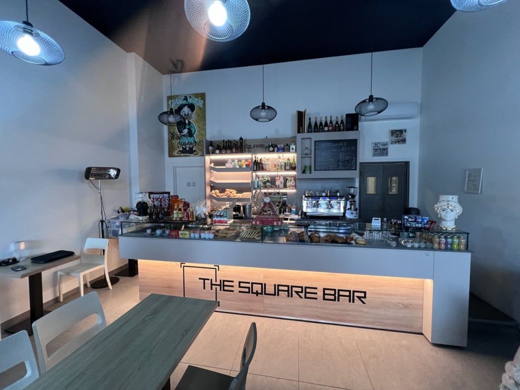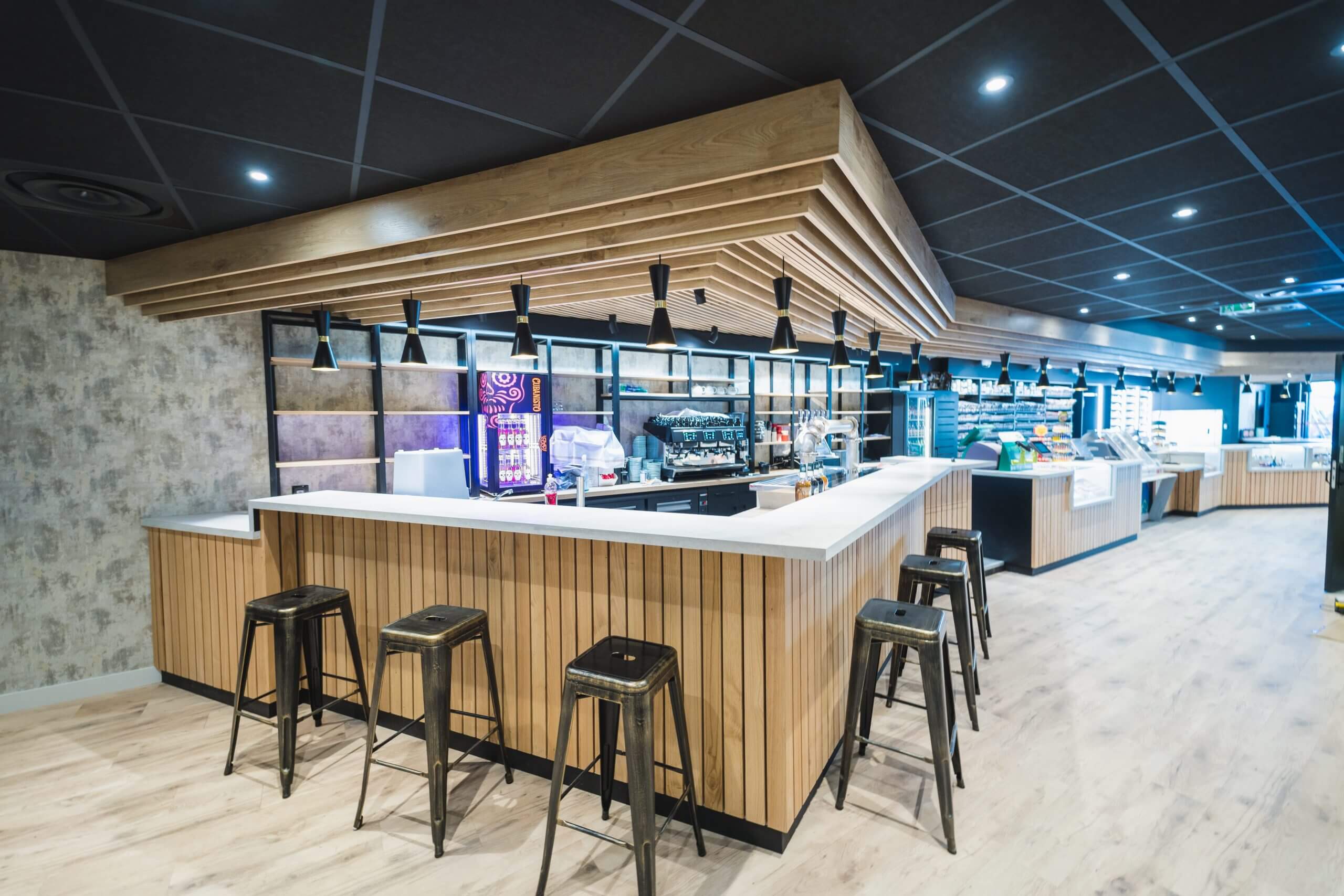 Un comptoir sur mesure associant stratifié effet bois, blanc mat et gris mat, avec un plan client en verre extra-clair. Entièrement équipé, il intègre cellules réfrigérées, vitrine froide encastrée, zone café avec bac à marc et trémie, ainsi qu’un arrière-bar sublimé par des étagères LED.